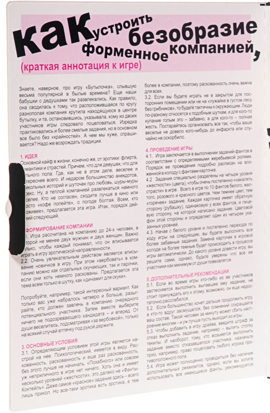 Для того чтобы получить удовольствие в сфере интимных забав, недостаточно тривиальных штампов и подходов. Нельзя ограничивать себя рамками ханжеских условностей и лицемерных предпочтений. Здесь всегда уместны яркие провокационные действия и смелые эксперименты. А для их эффективного внедрения современная секс-индустрия предлагает широкий ассортимент аксессуаров, приспособлений и элементов. В последнее время повышенный интерес у пользователей вызывает игра Фанты «Флирт № 8 Бутылочка». Ее результативность во взрослых играх не вызывает сомнений.