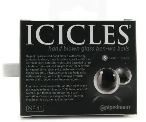 Вагинальные шарики ICICLES BEN-WA BALLS SMALL. Сделаны из специального стекла, очень гладкие. Для более ярких ощущений можно нагреть или охладить под струей воды. Диаметр – 2,5 см , вес – 17 грам (каждый).